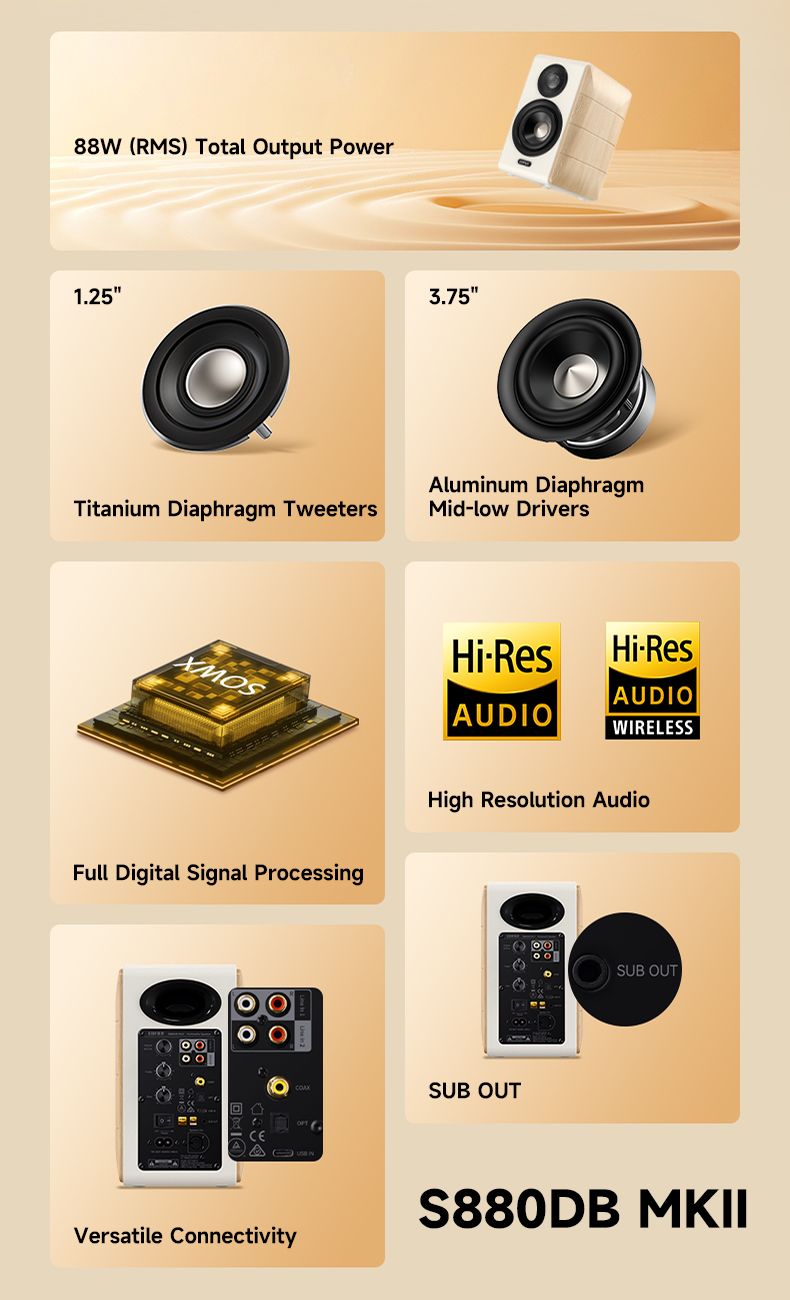 Total output Power(RMS): | Tweeter: 12W x2 / Mid-bass driver: 32W x2 |