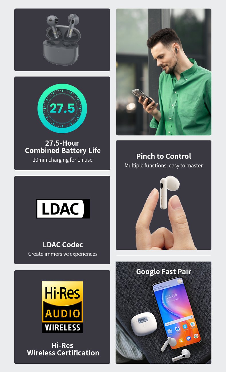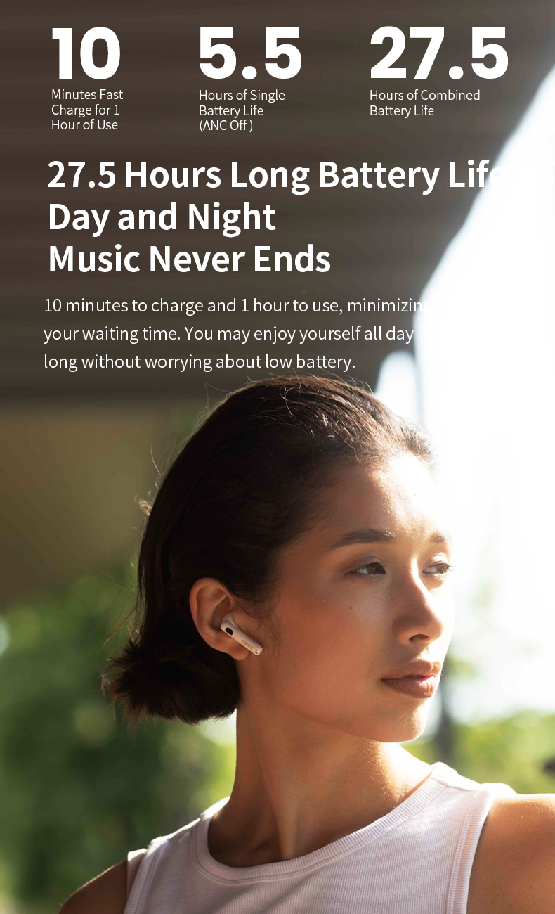 Playtime(hours): | ANC On: 3.5h(earbuds) + 14h(charging case) ANC Off: 5.5h(earbuds) + 22h(charging case) |
