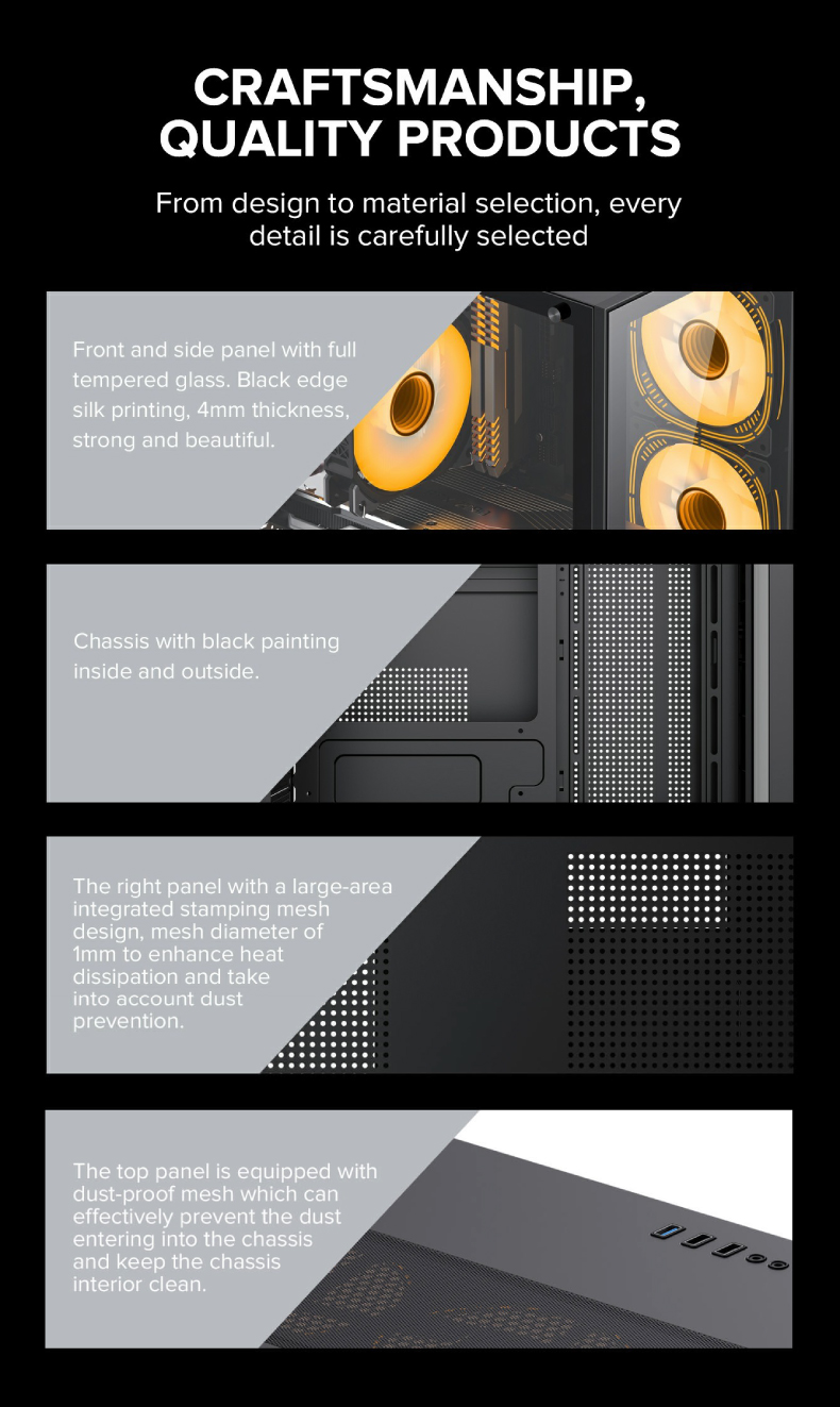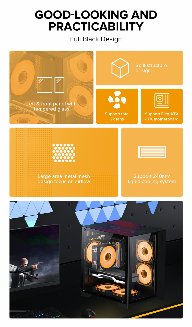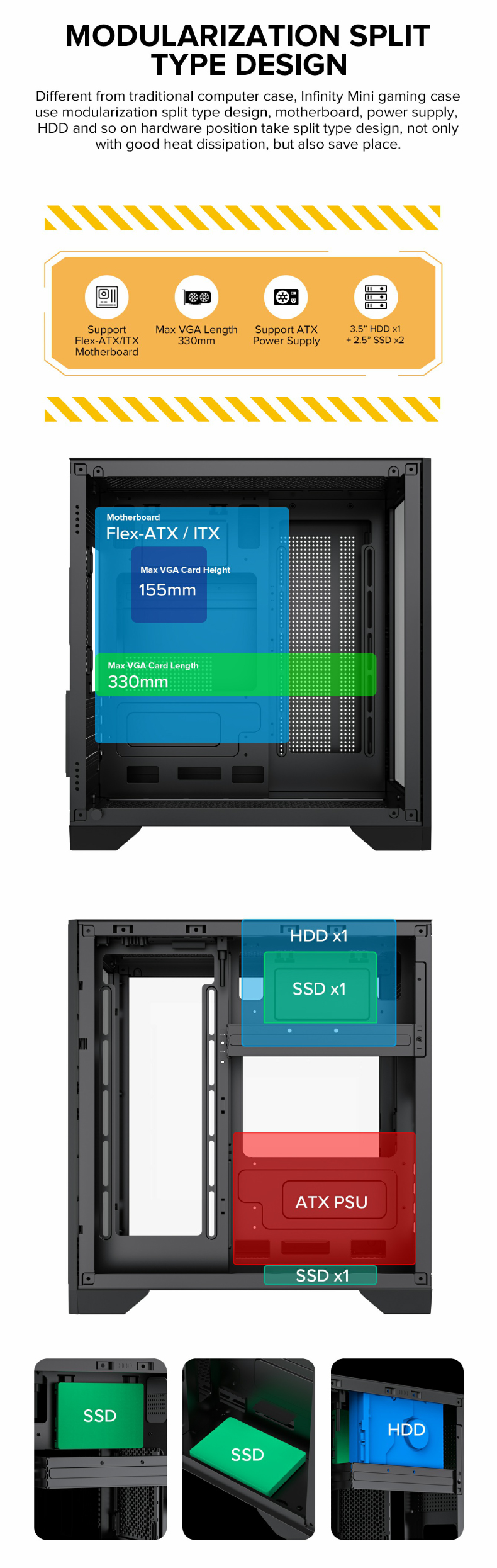 ⚡[2 Tempered glass]– Infinity Mini gaming case is equipped with 2 * 3mm thick tempered glass, which can clearly see the RGB lighting and the components in the building, Creating a good gaming atmosphere.