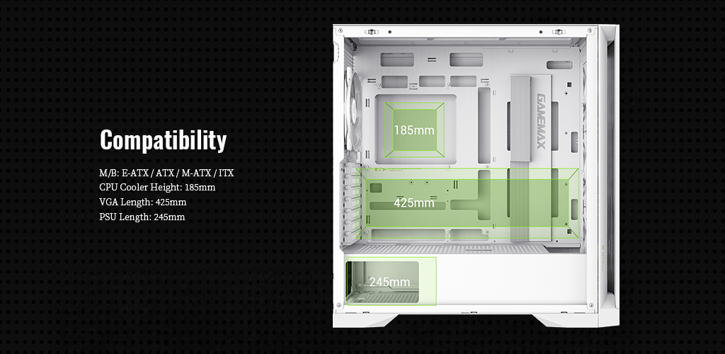 ⚡ Comprehensive compatibility: Supports E-ATX motherboards, 425mm graphics cards, 420mm water cooling radiators, 245mm power supplies, and 185mm air cooling radiators to ensure a variety of hardware configurations.