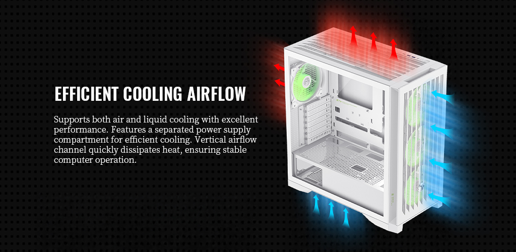 | Water Cooling Support(Radiator Size) – Front | 120mm, 140mm, 240mm, 280mm, 360mm, 420mm |