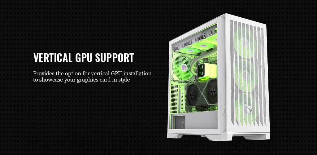 ⚡ Easy assembly: Features a tool-free design, vertical graphics card support, hidden cable routing, and a removable cover.