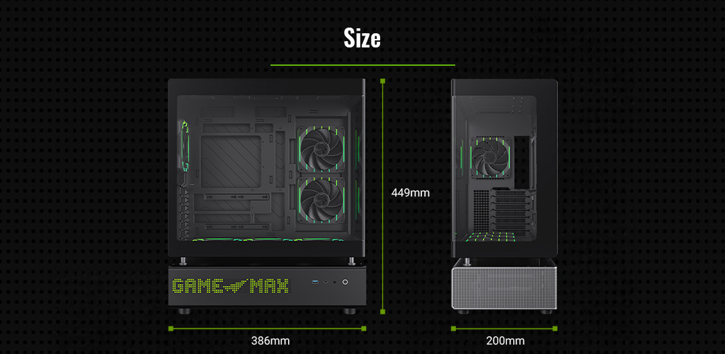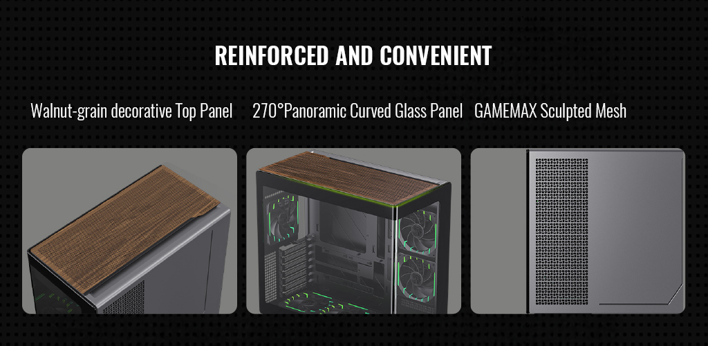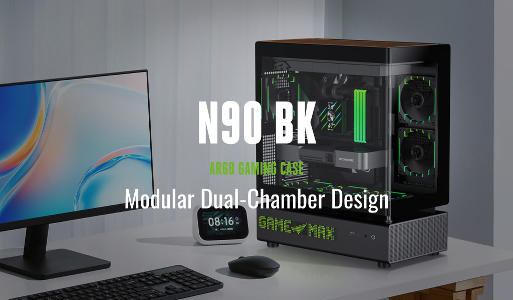 GAMEMAX N90 Modular Dual-Chamber PC Case with 512-LED Display, 270° Curved Glass & BTF Support.