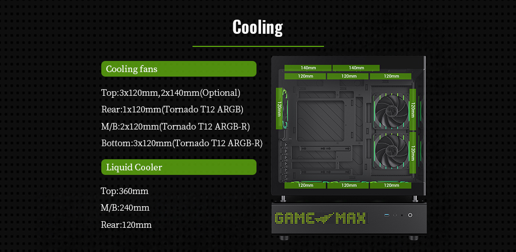 | Cooling Fan Support – Bottom | 3x120mm(Tornado T12 ARGB-R) |