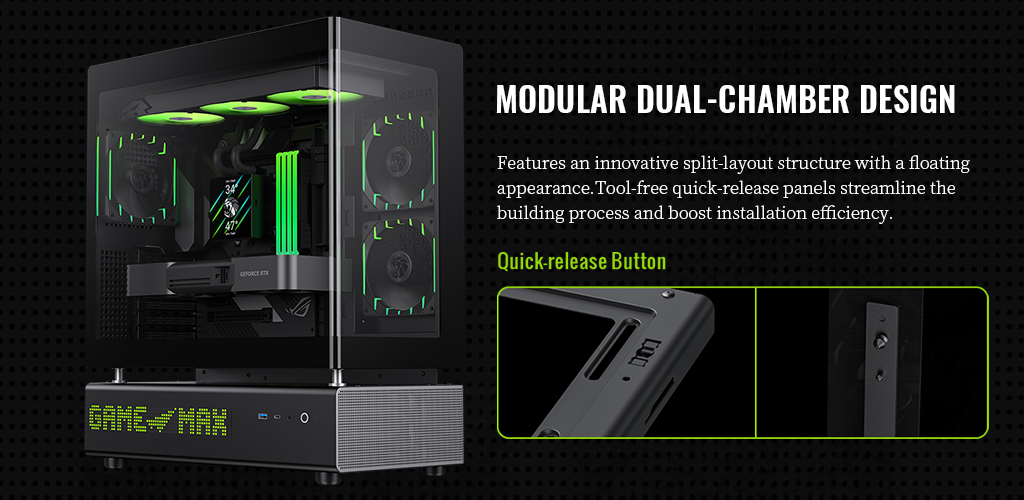 ⚡ Modular Dual-Chamber Design: Features an innovative split-type floating structure and tool-free quick-release panels, greatly improving assembly efficiency