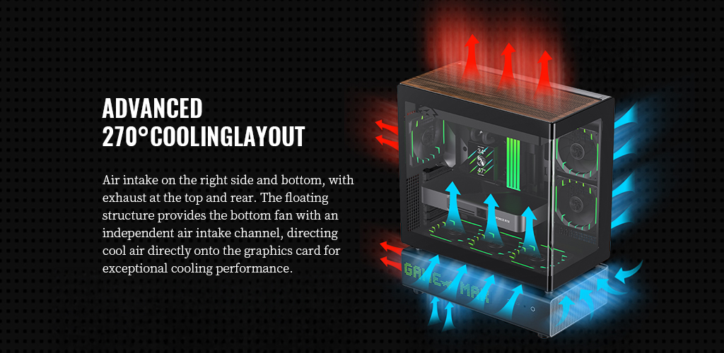 ⚡ 270° Advanced Cooling Layout: Combines side-mounted fan positions, split-chamber cooling, and custom ventilation zones; comes pre-installed with 6 ARGB PWM fans