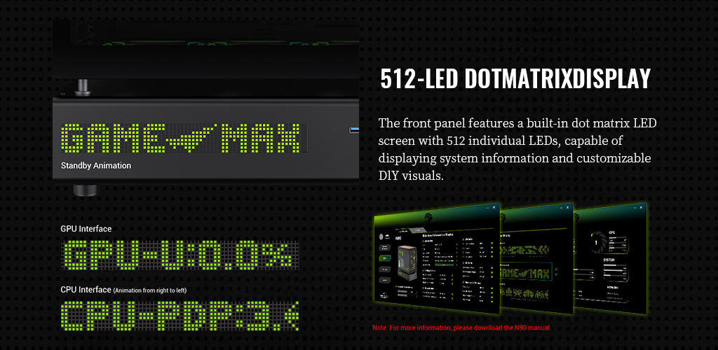 ⚡ 512-LED Dot Matrix Display: Equipped with a built-in front-panel screen, supporting system information display and DIY custom visual effects