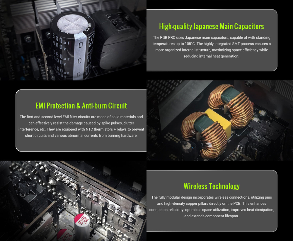 • 高品質零件:採用日本 105°C 電容與固態電容,確保在高強度使用下仍具備耐用性、穩定性與可靠性。