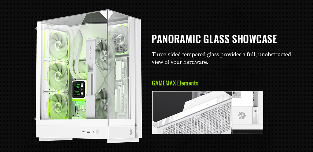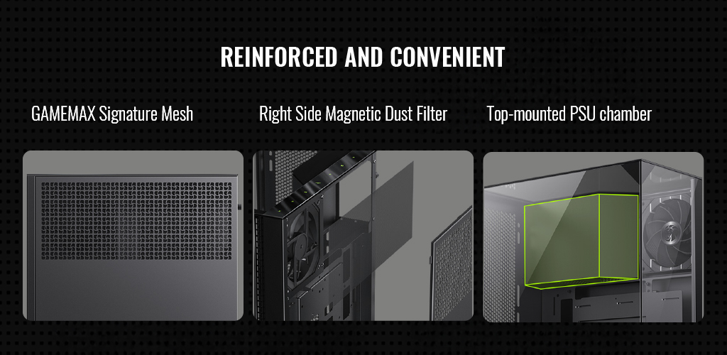 Side Panel – Right | Metal cover, GAMEMAX Proprietary Mesh |