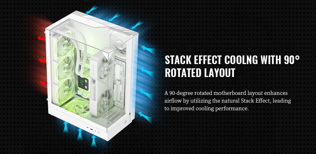 ⚡ 90 度旋轉主機板設計:利用「堆疊效應(Stack Effect)」提升垂直氣流,有效加強散熱表現。