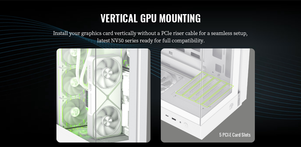 ⚡ 支援垂直安裝顯示卡:無需延長線即可垂直安裝,兼容 NV50 系列顯示卡。