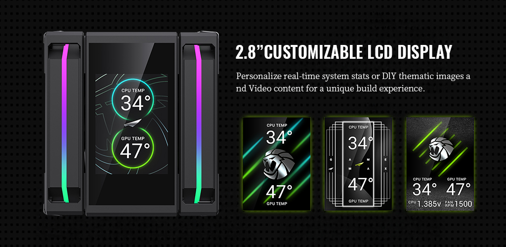 – ⚡2.8 吋可自訂 LCD 顯示螢幕 — 可個人化顯示即時系統資訊,或自訂主題圖片與影片內容,打造獨一無二的電腦風格。
