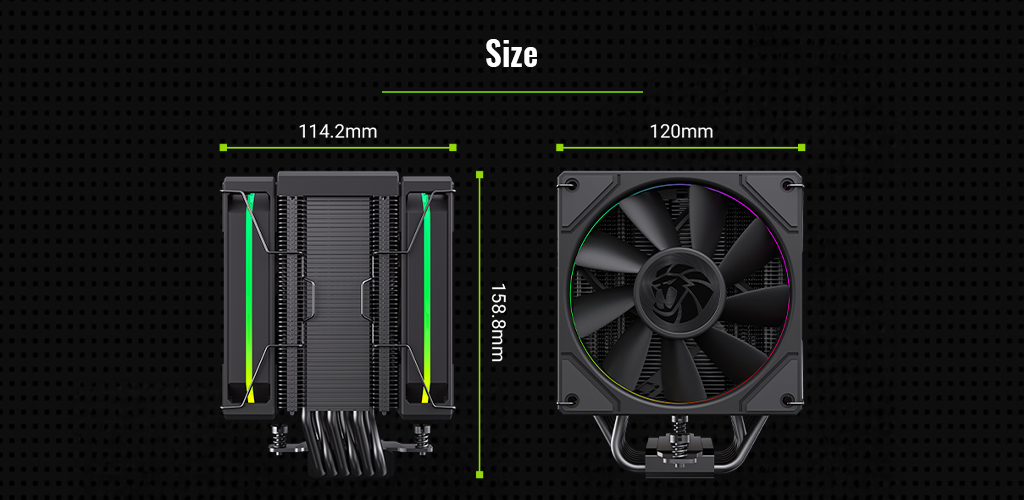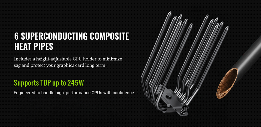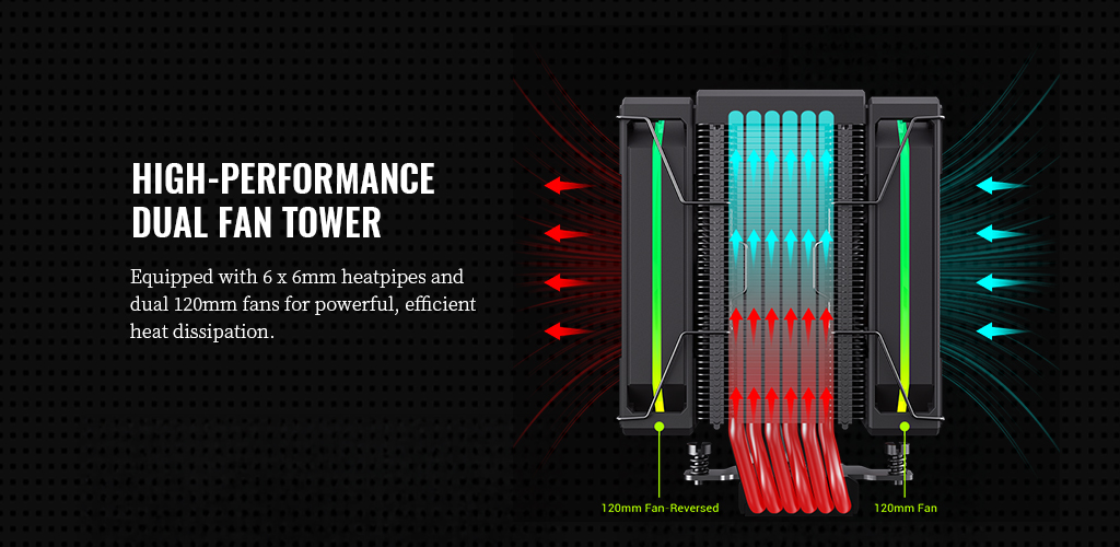 – ⚡高效能雙風扇塔式設計 — 配備 6 根 6mm 熱導管與雙 120mm 風扇,有效快速散熱。