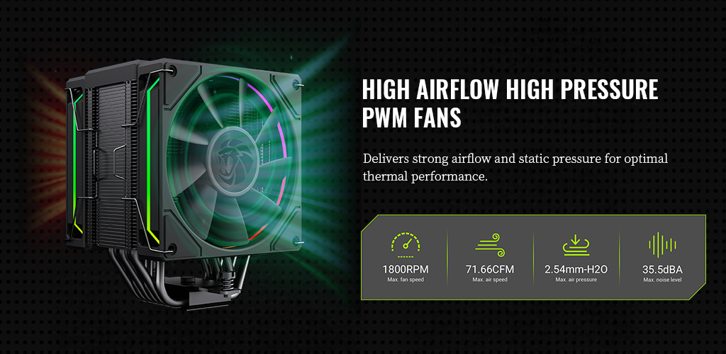 – ⚡ 高風量、高風壓 PWM 風扇 — 提供強勁氣流與靜壓,確保最佳散熱表現。